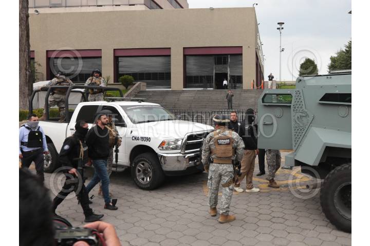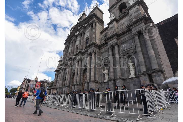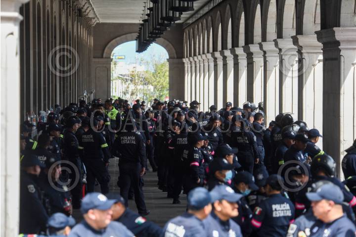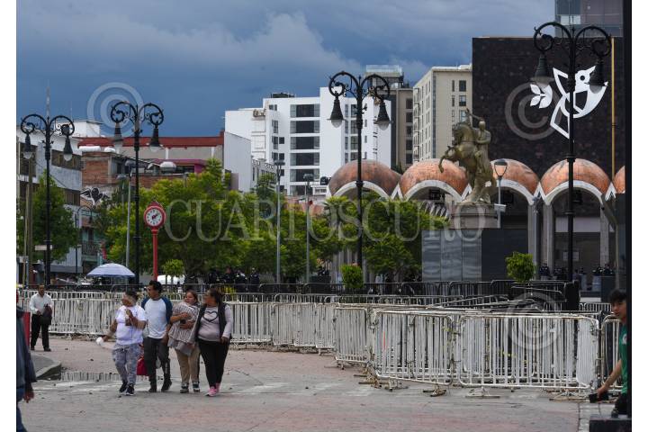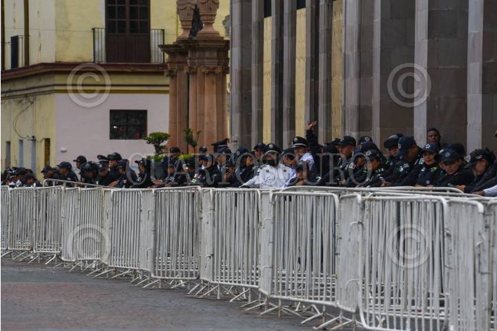 TOLUCA, ESTADO DE MÉXICO, 28SEPTIEMBRE2024.- Un fuerte dispositivo de seguridad se estableció en el primer cuadro de la Toluca en los edificios de Palacio de Gobierno, Cámara de Diputados, TSJEM, Catedral y el Ayuntamiento de Toluca y Teatro Morelos, vallas y policías estatales y municipales resguardan los inmuebles. FOTO: CRISANTA ESPINOSA AGUILAR /CUARTOSCURO.COM