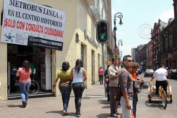 MÉXICO, D.F., 25JULIO2011.- Integrantes de la Unión de Vecinos y Comerciantes del Poligonal del Centro Histórico A.C., colocaron mantas en negocios del primer cuadro de la ciudad donde exigen se realice una consulta ciudadana para poder continuar las obras del metrobús en el centro histórico. FOTO: SAÚL LÓPEZ/CUARTOSCURO.COM