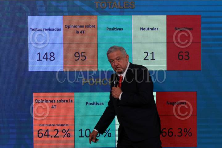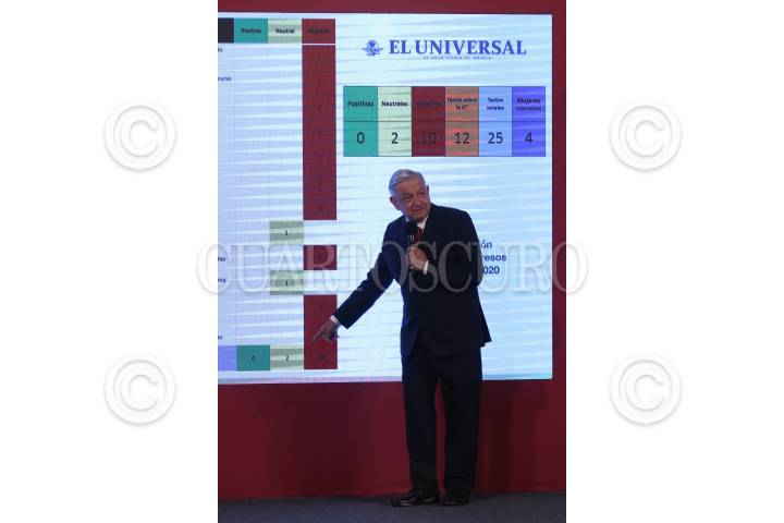 Andrés Manuel López Obrador durante la conferencia matutina donde expuso un análisis de las opiniones publciadas en medios de comunicación, donde afirma que es el gobierno con mayor crítca dentro de estos espacios. FOTO: GALO CAÑAS/CUARTOSCURO.COM