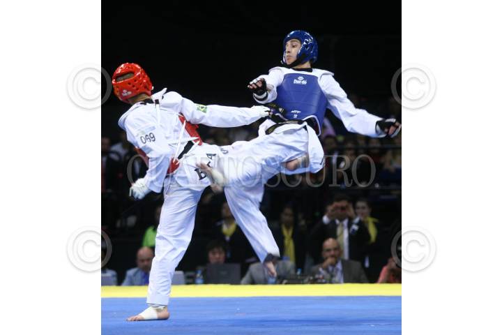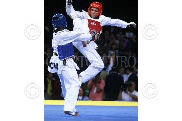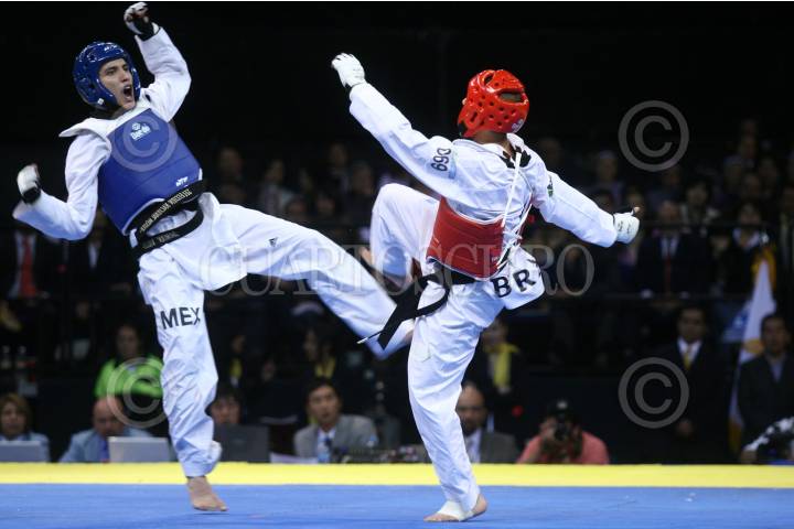 MÉXICO, D.F., 14NOVIEMBRE2009.- Gabriel Mercedes de Republica Dominicana combate con su oponente de Brasil Marcio Ferreira, durante la final del encuentro de la liga mundial de Taekwondo celebrada en el Palacio de los Deportes. FOTO: SÁSHENKA GUTIÉRREZ/CUARTOSCURO.COM