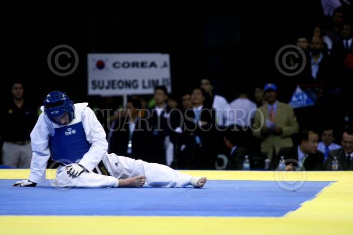MÉXICO, D.F., 14NOVIEMBRE2009.- Steren Lopez de USA cae ante knocaut durante la final del encuentro de la liga mundial de Taekwondo celebrada en el Palacio de los Deportes. FOTO: SÁSHENKA GUTIÉRREZ/CUARTOSCURO.COM