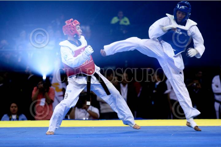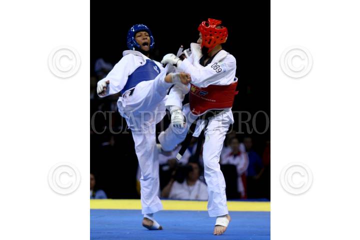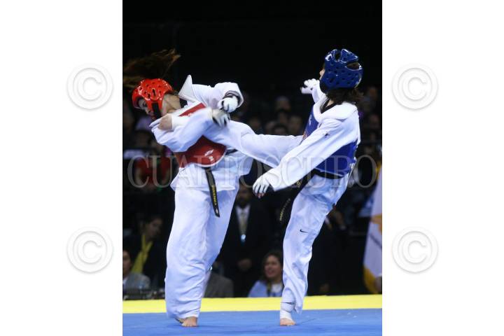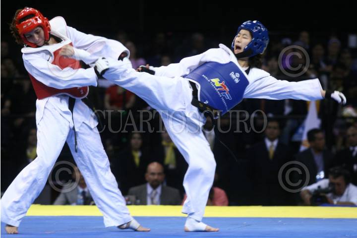 MÉXICO, D.F., 14NOVIEMBRE2009.- Sujeong Lim de Corea combate con su oponente de Guatemala Euda Carias Morales en final del encuentro de la liga mundial de Taekwondo celebrada en el Palacio de los Deportes. FOTO: SÁSHENKA GUTIÉRREZ/CUARTOSCURO.COM