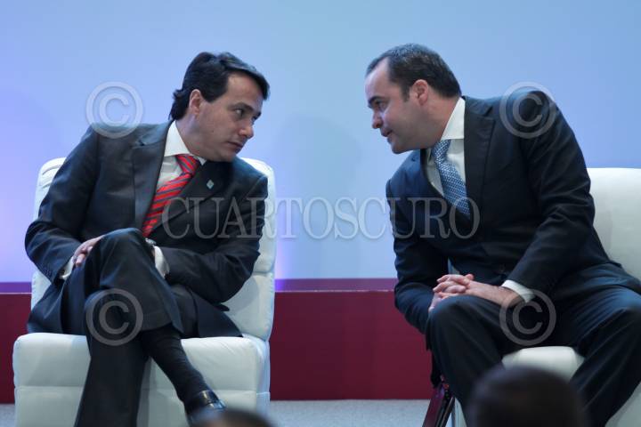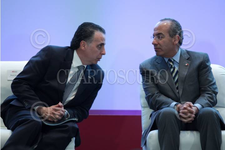 MÉXICO, D.F. 06MAYO2010.- Bruno Ferrari Garcia, director general de ProMéxico conversa con el presidente Felipe Calderón durante el evento México es Oportunidad para la Inversión Extranjera que se realizo en el hotel St. Regis. FOTO: RODOLFO ANGULO/CUARTOSCURO.COM