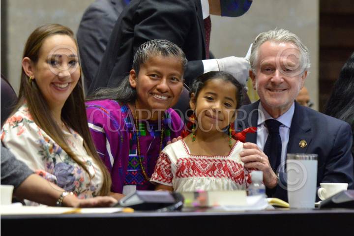 Andrea Betzabeth Medina Tapia, hablante de la lengua Otomí, se toma una fotografía con Santiago Creel, presidente de la mesa directiva, Noemi Berenice Luna, vicepresidenta de la mesa directiva e Irma Juan Carlos, diputada de Morena, al finalizar su intervención "Las lenguas toman la tribuna" en la sesión ordinaria de la Cámara de Diputados.