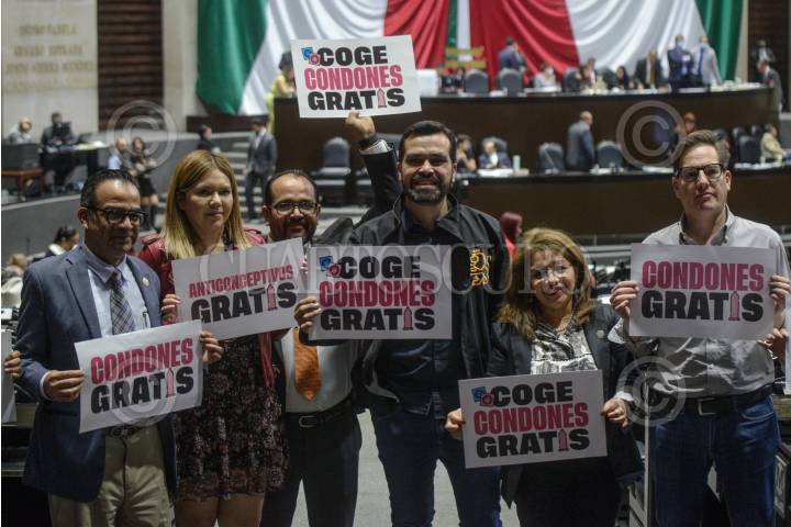 Diputados de Movimiento Ciudadano muestras cartulinas para fomentar el uso del condón.