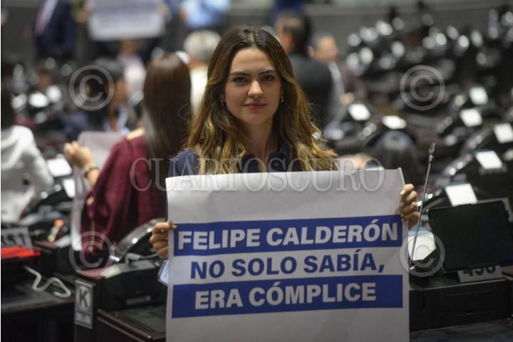 Cecilia Márquez Alkadef, diputada de Morena, muestra una foto en donde aparecen: Genaro García Luna, ex secretario de Seguridad Pública; Felipe Calderón, ex presidente de México y su esposa Margarita Zavala.