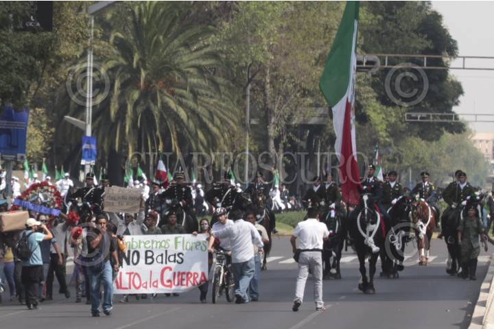 MÉXICO, D.F., 20NOVIEMBRE2011.- Integrantes del moviemiento de Los Indignados, se manifestaron en medio del desfile Deportivo militar que organizó el gobierno sobre paseo de la reforma. FOTO: ENRIQUE ORDÓÑEZ/CUARTOSCURO.COM