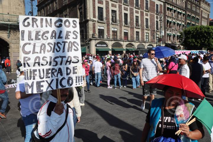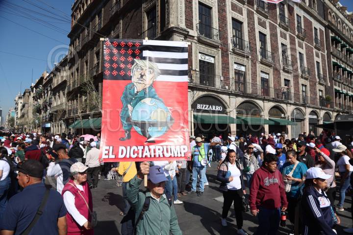 CIUDAD DE MÉXICO, 09MARZO2025. Asistentes a la “Asamblea informativa” en el zócalo de la Ciudad de México, encabezada por Claudia Sheinbaum, presidenta de México mostraron su descontento con el gobierno de Estados Unidos tras las amenazas de la imposición de aranceles a productos mexicanos. FOTO: EDGAR NEGRETE LIRA/CUARTOSCURO.COM