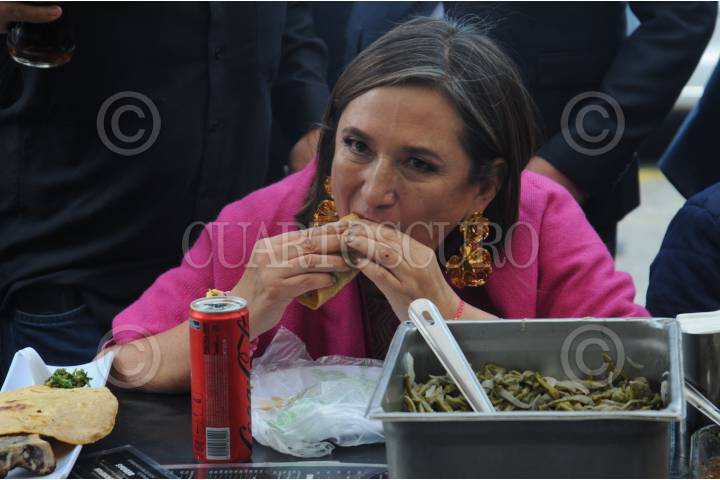 CIUDAD DE MÉXICO, 08OCTUBRE2023. - Xóchitl Gálvez se detuvo en un puesto para poder comer unos tacos luego del evento en el WTC. FOTO: DANIEL AUGUSTO /CUARTOSCURO.COM