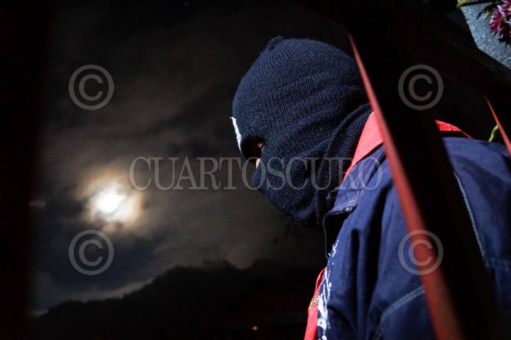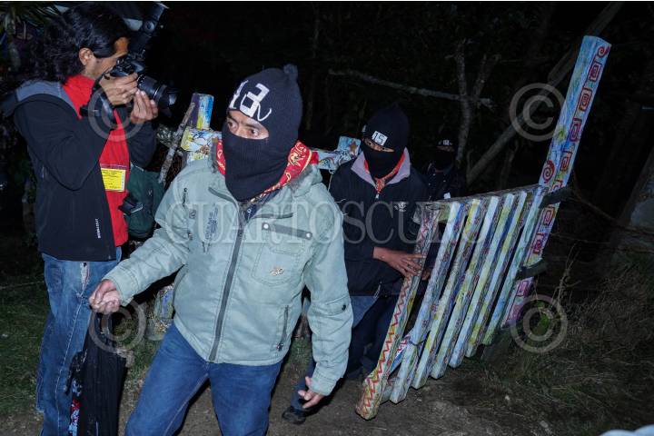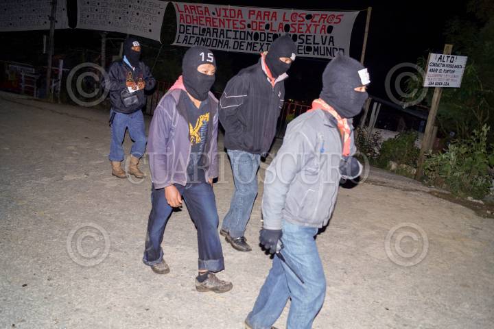 OVENTIC, CHIAPAS, 01ENERO2013.- Hoy se cumplen 19 años de la aparición pública y declaración de guerra que el Ejercito Zapatista de Liberación Nacional (EZLN), hizo al Gobierno Federal y al Ejército Mexicano. El EZLN en su mayoría indígenas choles, zoques, tzotziles, tzeltales, mames y tojolabales; reaparecieron el 21 de diciembre pasado con la toma de las mismas cabeceras municipales tomadas aquel 01 de diciembre de 1994, pero ahora de manera pacifica. Los pueblos zapatistas son un referente organizativo y de lucha a nivel mundial por el grado en que han cambiado sus condiciones de vida en sus territorio autonomo. En la imagen, zapatistas vigilan la entrada a la fiesta y evento para los pueblos que en el Caracol de Oventic realizaron la madrugada de este día. El Caracol Resistencia y Rebeldía por la Humanidad o Caracol de Oventic, congrega los Municipios Autónomos Zapatistas de los altos de Chiapas: San Andrés Sacamch’en de los Pobres, San Juan de la Libertad, San Pedro Polhó, Santa Catarina, Magdalena de la Paz, 16 de febrero y San Juan Apóstol Cancuc. FOTO: ADOLFO VALTIERRA /CUARTOSCURO.COM