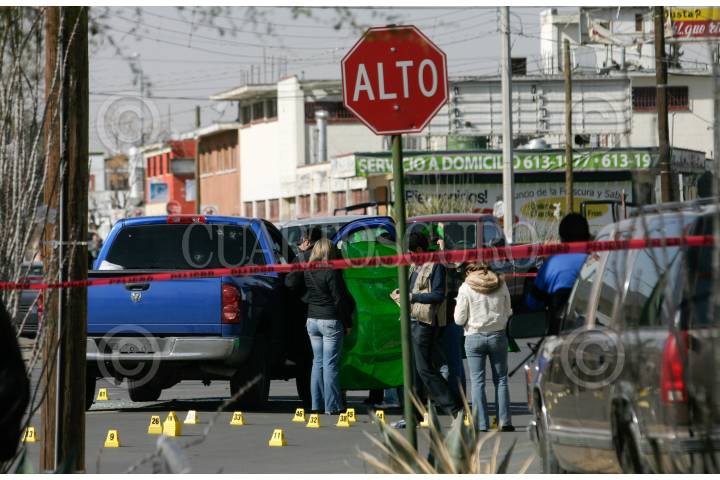 CIUDAD JUÁREZ, CHIHUAHUA, 20ENERO2009.- Un par de agentes de la Agencia Estatal de Investigación, fueron ejecutados en el interior de su vehículo cuando transitaban por el cruce de las calles 20 de Noviembre y Francisco Montes de Oca. Los cadaveres de los agentes identificados solo como Compean y Chavez, adscritos al departamento de autos robados quedaron en el interior del vehículo oficial y en el sitio fueron hallados mas de medio centenar de casquillos percutidos. De los agresores no se tiene alguna pista que de con su paradero. FOTO: J GUADALUPE PEREZ/CUARTOSCURO.COM