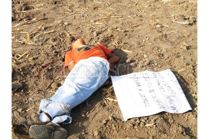 TEXCOCO, ESTADO DE MÉXICO, 05MAYO2009.- Un joven apareció con un tiro en la cabeza y un narcomensaje que citaba "Esto les va a pasar a los violadores, asaltantes, chapulines y a los Q´ se hagan pasar x otros", en un paraje en el pueblo de Santiago Cuautlalpan. FOTO: SAÚL LÓPEZ/CUARTOSCURO.COM