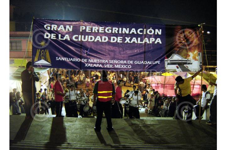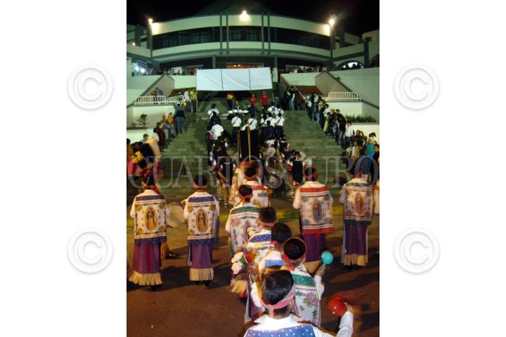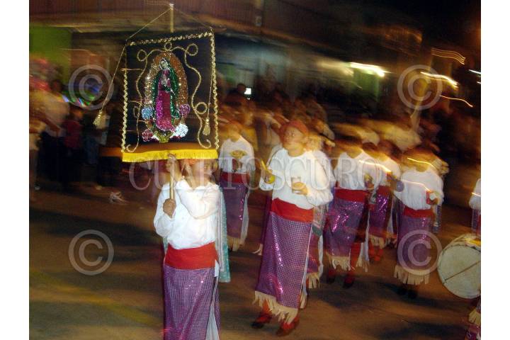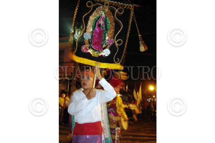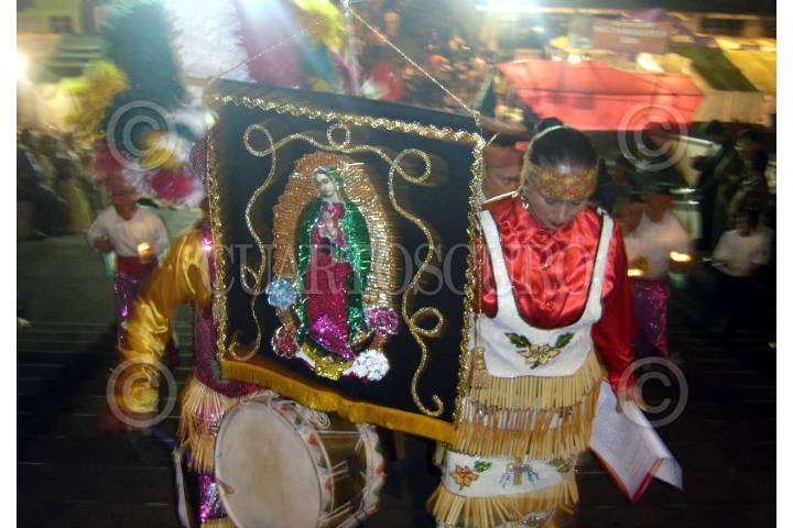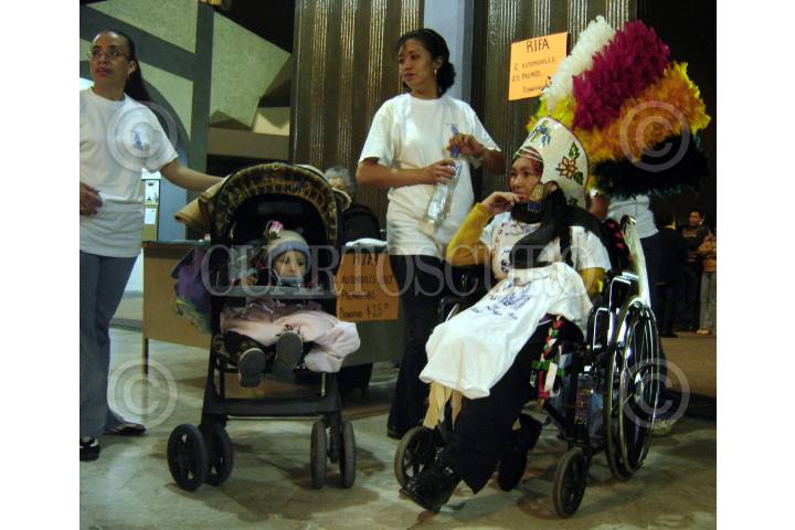 XALAPA, VERACRUZ 09 DICIEMBRE 2007.- Encabezando la peregrinación de la ciudad de xalapa al Santuario de nuestra señora de Guadalupe, un grupo de niños danzantes representaron la danza de los matachines originaria de aguascalientes, antes de entrar al recinto y al interior de este, previo a la misa dictada por el ex obispo de la ciudad Sergio Obeso Rivera, los danza fue dedicada la señora abuela danzante quien por problemas de salud acudió en silla de ruedas. FOTO: JORGE VALDÉS/CUARTOSCURO.COM