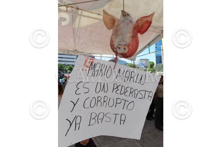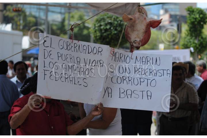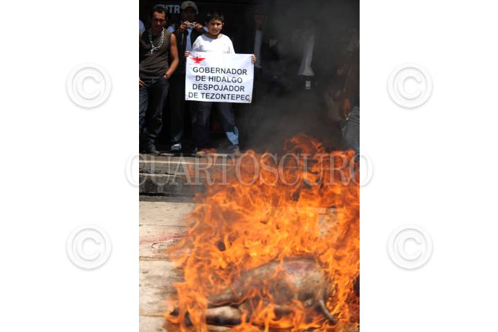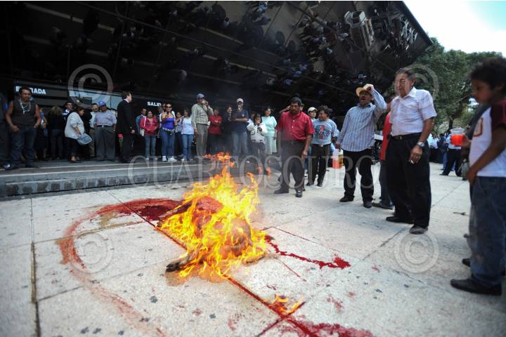 MÉXICO, D.F., 28SEPTIEMBRE2009.- Oriundos del Estado de Hidalgo y Puebla se manifestaron en las afueras del Senado en la Torre del Caballito por la desaparición de la Institución Secretaria de la Reforma Agraria (SRA) motivo por el que sacrificaron un cerdo y lo calcinaron en el lugar. Dichas consignas fueron lanzadas principalmente contra los gobernadores de estos Estados. FOTO: LUIS CARBAYO/CUARTOSCURO.COM