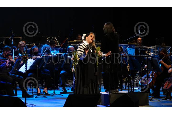 La cantante Leiden acompañada de la Orquesta Filarmónica de la Ciudad de México, durante un concierto en conmemoración al Día Internacional de la Mujer realizado en el Teatro de la Ciudad Esperanza Iris
