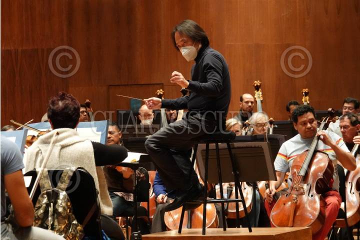 Scott Yo, director de la Orquesta Filarmónica de la Ciudad de México, durante un Ensayo General en la Sala Jose Revueltas en el Centro Cultural Ollin Yoliztli