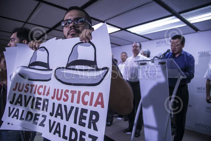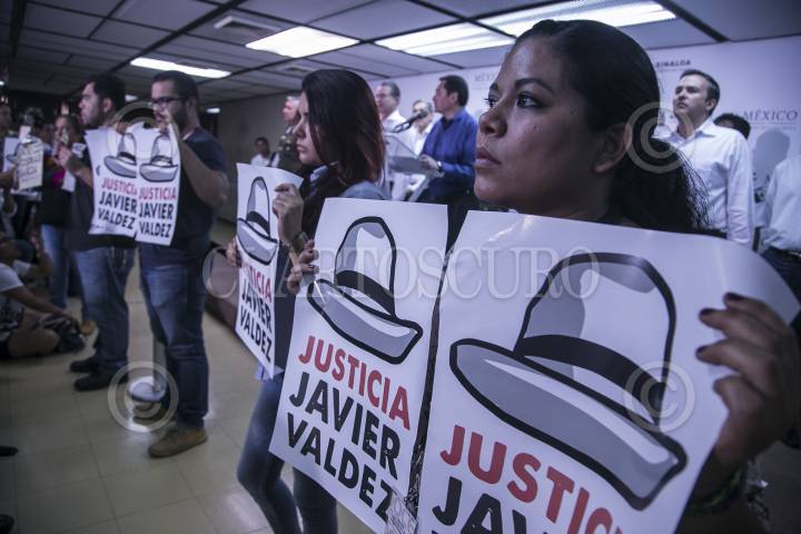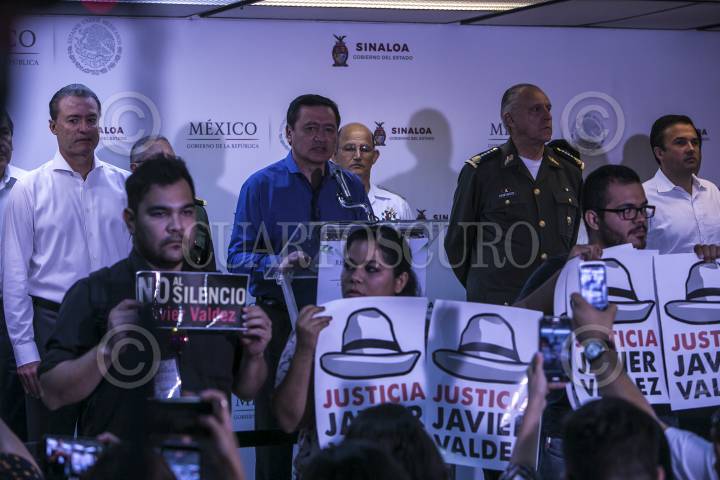 CULIACAN, SINALOA, 20JUNIO2017.- El Secretario de Gobernación Miguel Angel Osorio Chong en compañia de Quirino Ordaz Coppel gobernador del Estado y Salvador Cienfuegos, Secretario de la Defensa Nacional de México, encabezaron una conferencia de prensa donde se trataron principalmente temas de seguridad, durante el evento un grupo de periodistas se manifestarón para exigir justicia por el asesinato del periodista Javier Valdez. FOTO: RASHIDE FRIAS /CUARTOSCURO