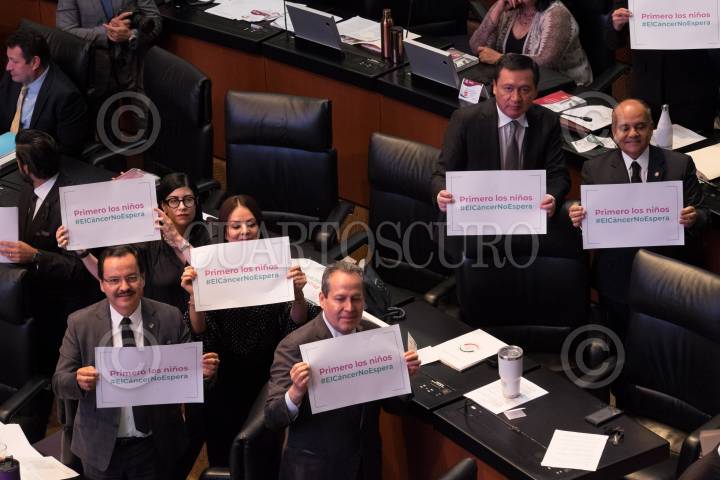 CIUDAD DE MÉXICO, 29ABRIL2019.- Osorio Chong, coordinador del PRI y sus compañeros posaron para una foto con un letrero con el hashtag ElCáncerNoEspera, para apoyar a los niños que padecen ésta enfermedad, durante la Sesión Ordinaria en la que se aprobó la Reforma Laboral en el Senado de la República. FOTO: GRACIELA LÓPEZ /CUARTOSCURO.COM