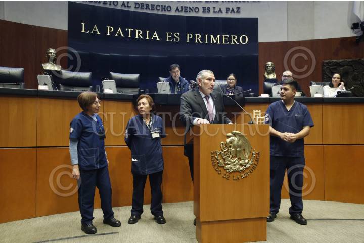 CIUDAD DE MÉXICO, 04DICIEMBRE2024.- Adán Augusto López, coordinador de los senadores de Morena, anuncio que partir del mes de enero de 2025 los trabajadores limpieza del Senado será contratados cómo trabajadores de base de la Cámara de Senadores, actualmente éstos trabajan en la modalidad de outsourcing. FOTO: CUARTOSCURO.COM