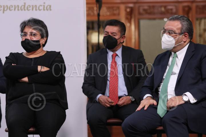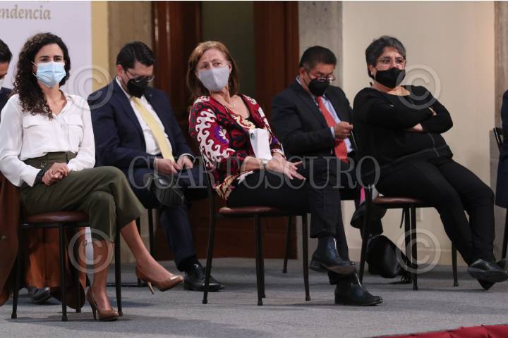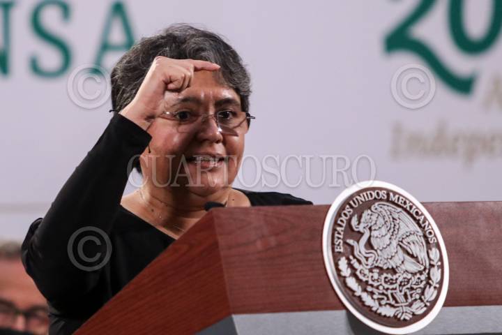 Raquel Buenrostro, jefa de Servicios de Administración Tributaria (SAT), durante la conferencia matutina.