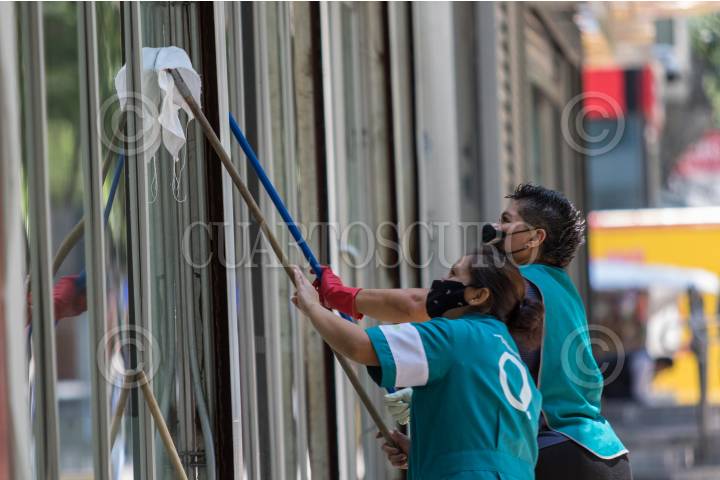 Un par de mujeres trabajan limpiando los cristales de un edificio en Paseo de la Reforma.