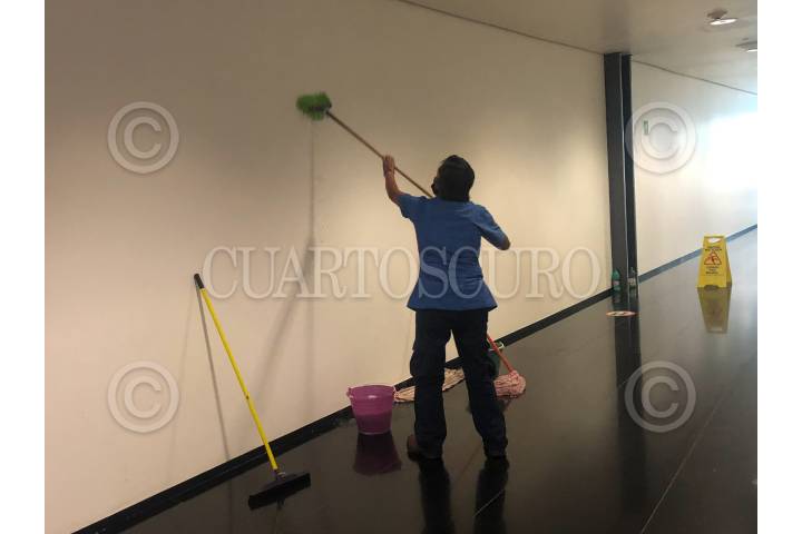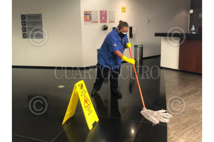 Una trabajadora de limpieza trapea el piso de los pasillos del Senado de la República