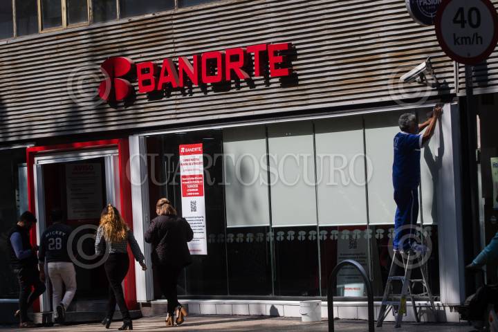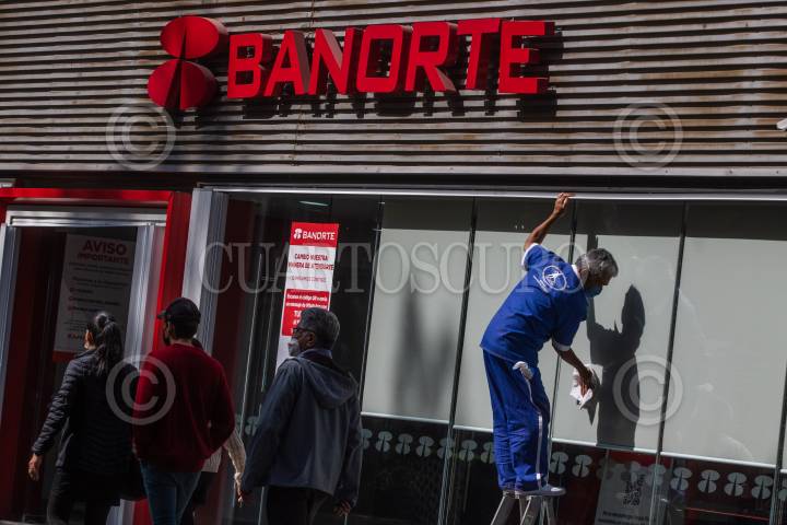 Un trabajador de intendencia limpia los vidirios de la fachada de un Banorte.