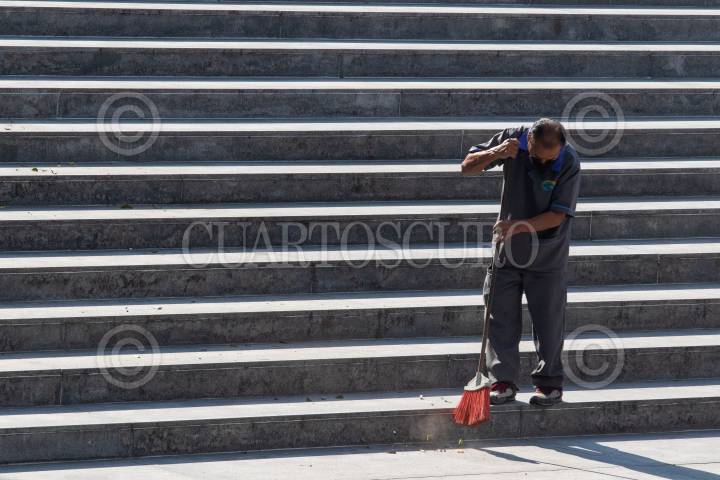 Un trabajador de una empresa de limpieza barre las escaleras de la Estela de Luz.