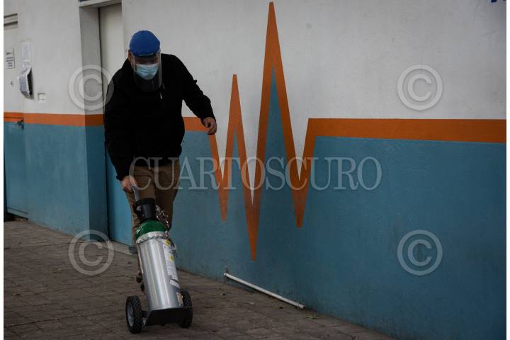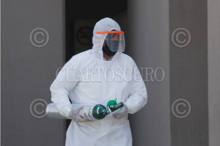 Un paramédico transporta un tanque de oxígeno en el Hospital de Especialidades "Belisario Domínguez"
