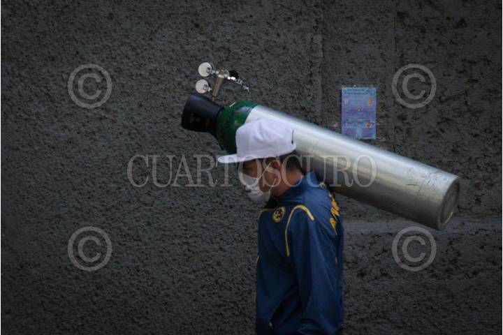 Una mujer arriba a la explanada del Parque San Jacinto para realizar el relleno de sus tanque de oxigeno para algún familiar contagiado por Covid-19.