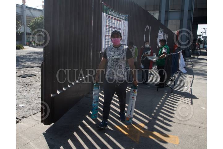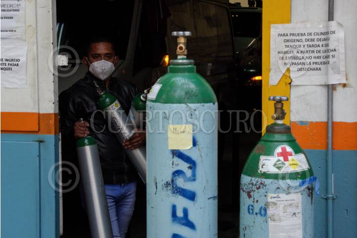 Decenas de personas hacen fila para rellenar sus tanques de oxigeno para sus familiares contagiados por SARS-CoV-2, esto en la explanada del parque San Jacinto.