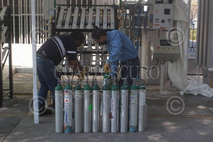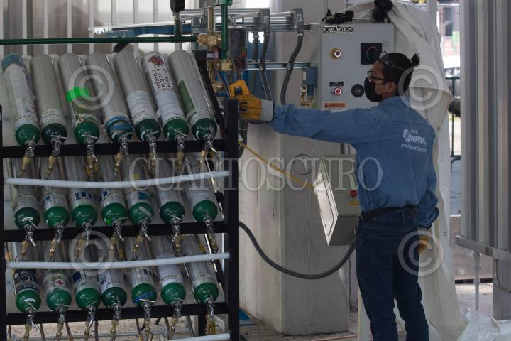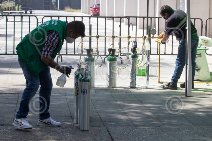 El "Centro de llenado de Oxígeno Medicinal" en la Sala de Armas de la Ciudad Deportiva Magdalena Mixhuca cuenta con un tanque de almacenamiento de oxígeno líquido con el que se podrán recargar 400 recargas de cilindros portátiles por día