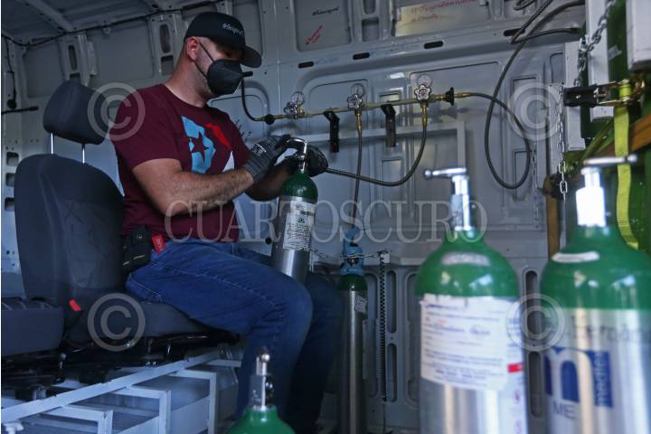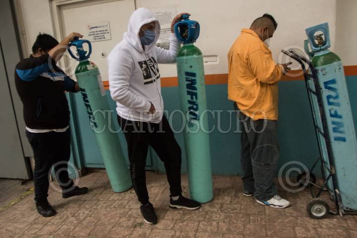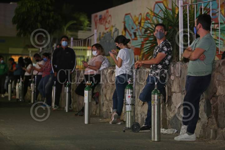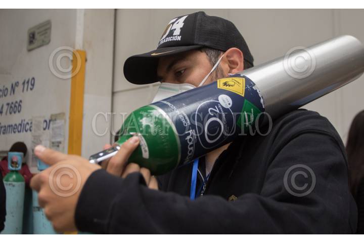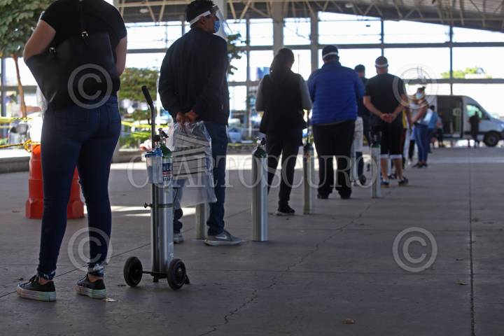 Decenas de personas acuden a rellenar sus tanques de oxígeno medicinal, debido a que tienen pacientes de Covid 19 en sus hogares.
