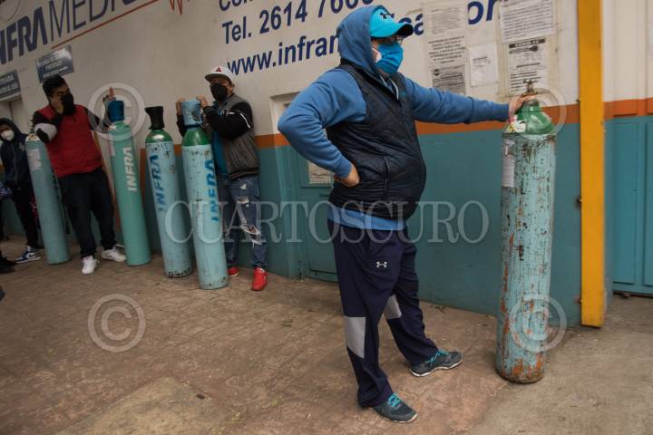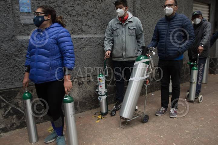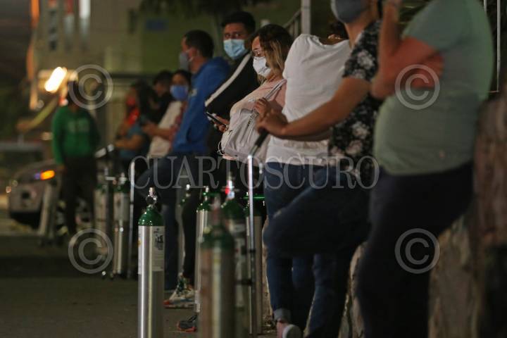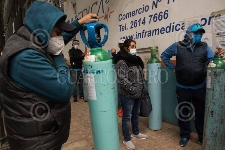 Familiares de personas contagiadas por coronavirus, hacen fila y esperan a ser atendidos para el relleno de sus tanques de oxigeno.