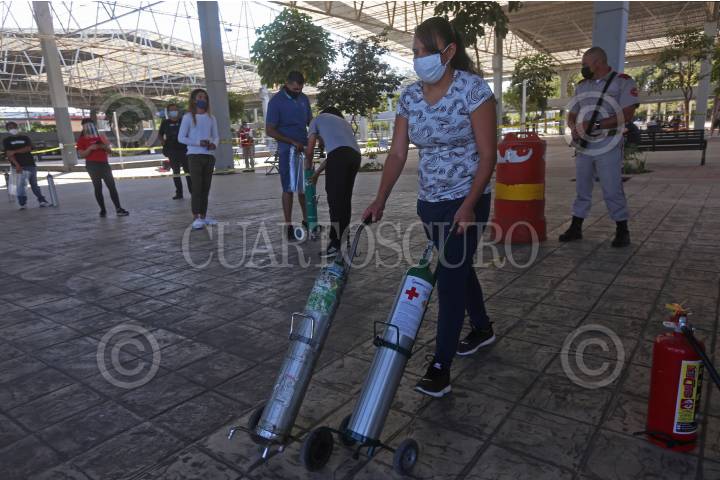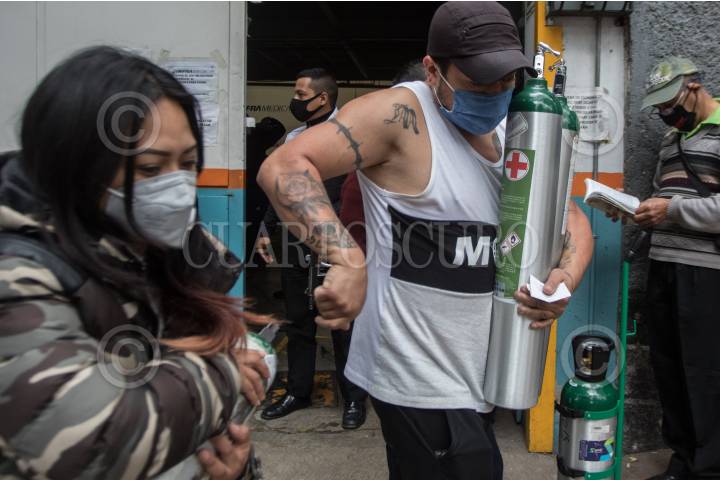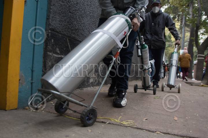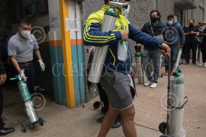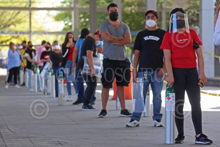 Decenas de personas hacen fila para rellenar sus tanques de oxigeno para sus familiares contagiados por SARS-CoV-2, esto en la explanada del parque San Jacinto.