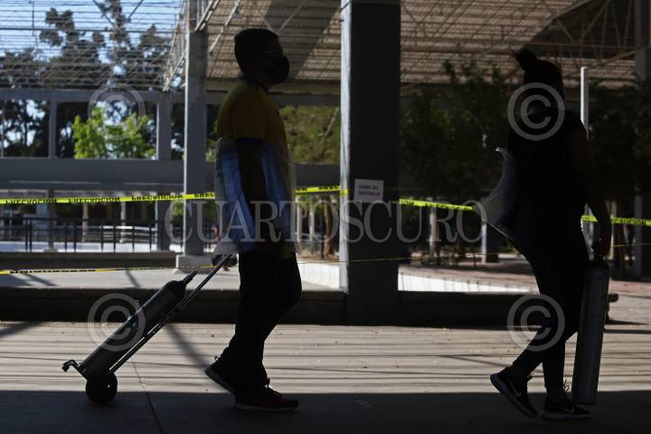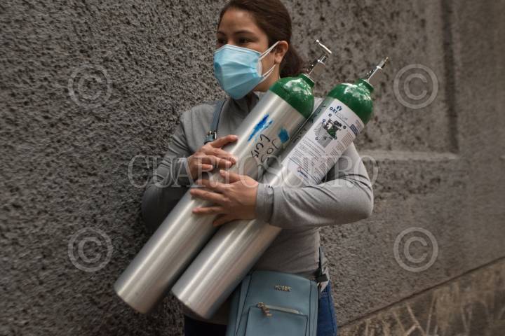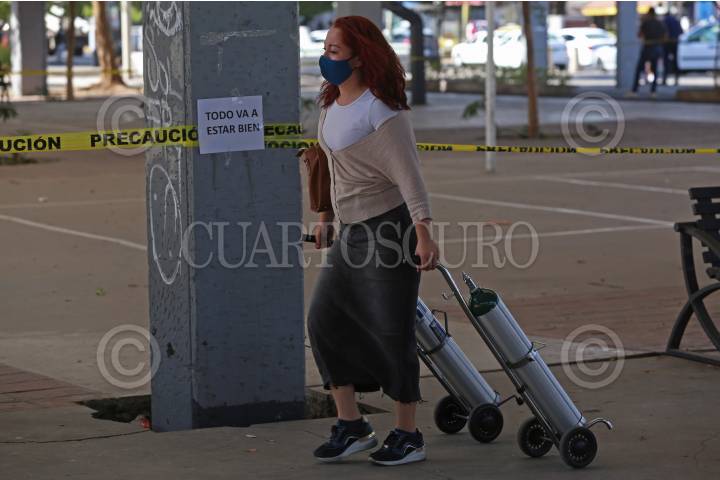 Una mujer arriba a la explanada del Parque San Jacinto para realizar el relleno de sus tanque de oxigeno para algún familiar contagiado por Covid-19.