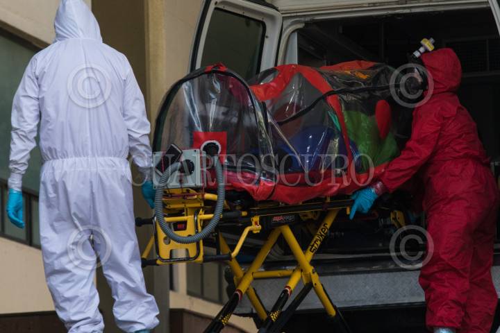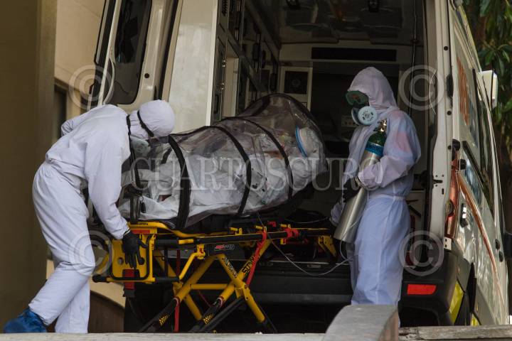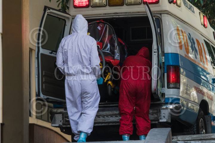 Paramédicos vuelven a trasladar al paciente con síntomas de Covid-19 que momentos antes habían ingresado al Triage Respiratorio del Centro Médico Siglo XXI.