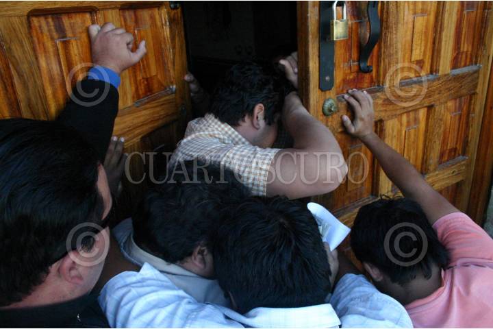 OAXACA, OAXACA 15ABRIL2008.- El Consejo Universitario aprobo que el Consejo Técnico de la Facultad de Medicina de la UABJO, recabe las propuestas que apoyan que los estudiantes de primer año que hayan reprobado materias en el primer año, afuera de las instalaciones un grupo de 50 estudiantes demandaban no se aplicará el nuevo reglamento que establece que quienes reprueben por tercera ocasión ya no podrán continuar sus estudios. Cuando se realizaba la sesion Alejandro Paz López, quien fuera director de la facultad de derecho, penetró por la fuerza junto con sus simpatizantes ahí se confrotó verbalmente con el rector de la Universidad Autonóma Benito Juárez de Oxaca, quien al finalizar los trabajos del consejo señalo que el espera se resuelvan los problemas internos de la facultad de derecho FOTO: MAX NUÑEZ/CUARTOSCURO.COM