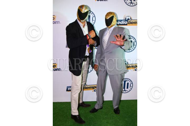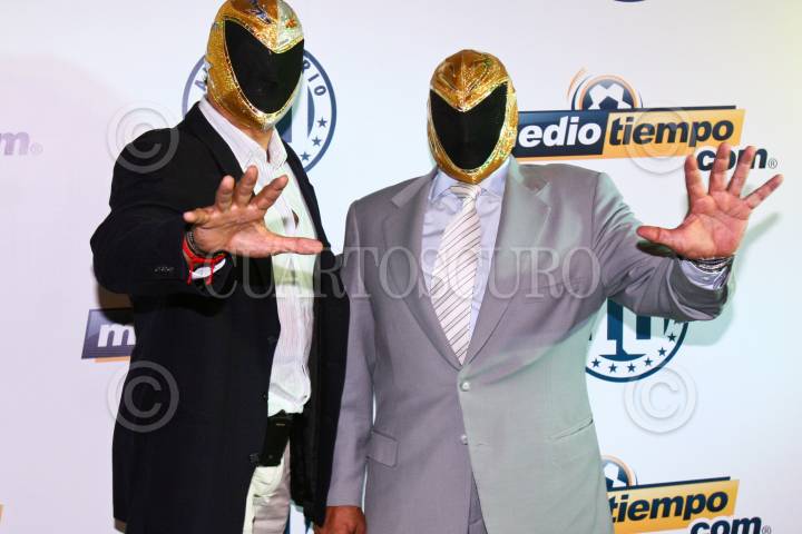 MÉXICO, D.F., 10MARZO2010.- Los luchadores Tinieblas y Tinieblas Jr. desfilaron por la alfombra verde del décimo aniversario de la página deportiva mediotiempo.com. FOTO: ISAAC ESQUIVEL/CUARTOSCURO.COM