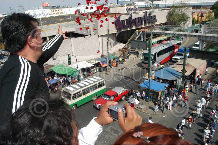 MÉXICO D.F. 09OCTUBRE2006.- Cientos de integrantes y simpatizantes de la APPO llegaron al Distrito Federal provenientes de Oaxaca. Los manifestantes exigen la salida del gobernador oaxaqueño, además de pedir una solución pacifica al conflicto magisterial. Un grupo de persona avienta pétalos de rosas a los integrantes del contingente. FOTO: GERMÁN ROMERO/CUARTOSCURO.COM