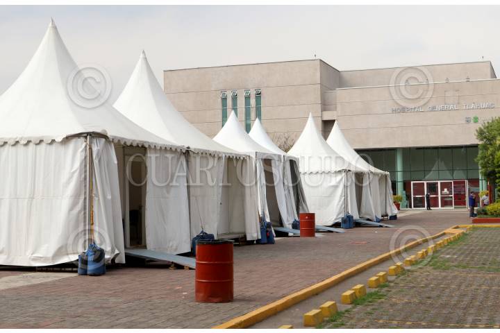 Desde el patio del Hospital General Tláhuac se observan las carpas que serán utilizadas para internar a pacientes con covid-19