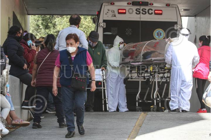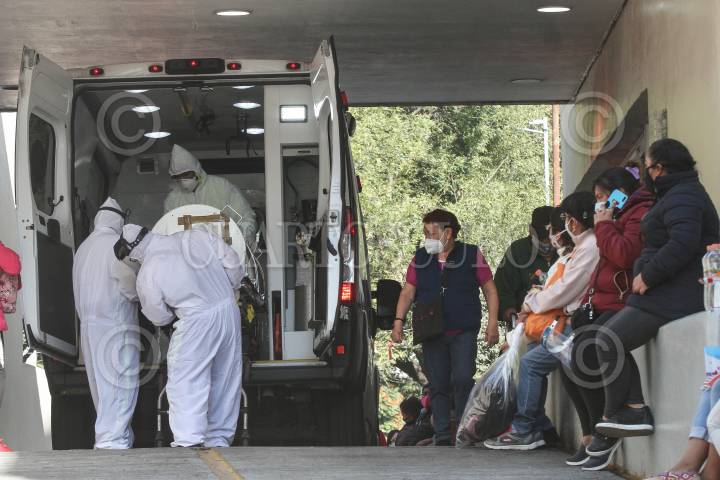 Decenas de curiosos observan el ingreso de una persona contagiado por COVID-19, en el Hospital de los Venados. FOTO: ROGELIO MORALES /CUARTOSCURO.COM