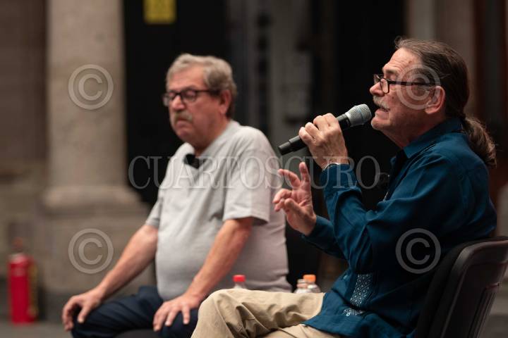 Dieter Müller, escritor y autor de la obra y Paco Ignacio Taibo II, director Del fondo de Cultura Económica (FCE) durante la presentación del libro, Café, espías, amantes que se llevo a cabo en el Museo de la Ciudad.