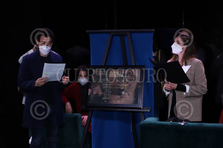 Los actores Adriana Llabés y Nacho Tahhan durante la revelación de placa por el fin de temporada de la obra de teatro “Orgullo” en el Foro Lucerna.