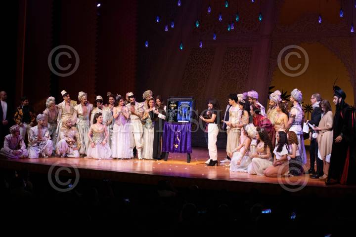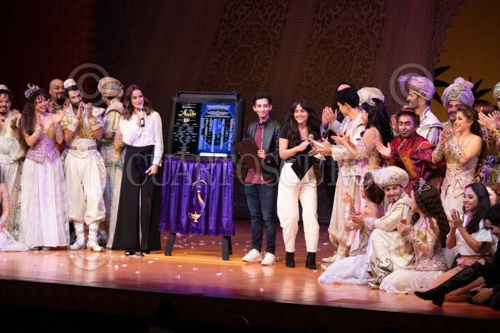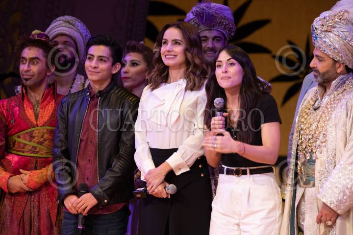Alejandra Barros, Donovan Carrillo y Zuria Vega durante la debelación de placa por las 100 representaciones del musical de Disney Aladdín en el Teatro Telcel.