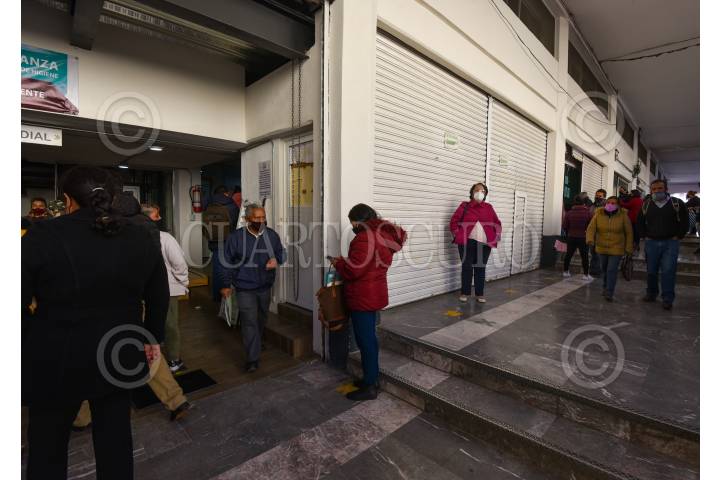 Una larga fila en los portales de Toluca de ciudadanos que acudieron a pagar el impuesto predial, sin conservar la sana distancia.