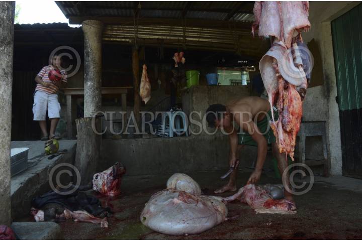 ACAPULCO, GUERRERO, 04ENERO2013.- Decenas de paisanos que regresaron de los Estados Unidos llegaron mero a la celebración de que desde hace un siglo a principios de año, el poblado Los Huajes, municipio de Acapulco, y dos Arroyos celebran a la virgen de Genoveva con música de viento, bailables populares, tamales, quema del torito y castillo. En su honor de los que llegaron mataron una res para el festejo. En Los Huajes las familias preparan a los jóvenes desde pequeños para vivir como migrantes en los Estados Unidos. A 90 kilómetros del puerto, las viviendas en muchos casos aún son de adobe, madera y teja, sin agua y sin drenaje. Las remesas son el pilar de la economía. El presidente del club de migrantes de Dos Arroyos, Edilberto Ceballos Carbajal, estimó que actualmente hay unos 5 mil personas de pueblos de la denominada ruta del sol de la zona rural de Acapulco, diseminados en Estados Unidos, principalmente California, Phoenix, Nevada y Nueva York, quienes se desempeñan en puestos de mano de obra, pega de azulejos y ensamblados. Ceballos Carbajal confesó que "uno allá tiene que llorar y aguantarse, sus lagrimas y en el camino del paso para cruzar para el otro lado tienen que comerse el excremento de las vacas" que encuentran a su paso dijo. FOTO: BERNANDINO HERNÁNDEZ /CUARTOSCURO.COM