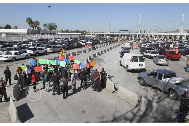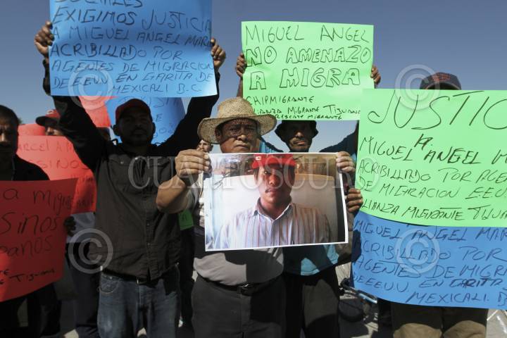 TIJUANA, BAJA CALIFORNIA, 26OCTUBRE2015.- Poco más de 30 integrantes de distintas asociaciones pro migrantes se manifestaron de forma pacífica en la garita de San Ysido, para exigir se investigue a fondo y se castigue al agente fronterizo que disparó y mató al migrante Miguel Ángel Marín, el pasado miércoles, en la garita entre Mexicali y Calexico. La manifestación se realizó simultáneamente en la garita de la capital del estado, a muy pocos metros de donde sucedió el hecho, al lugar acudieron 50 integrantes de la asociación “Ángeles sin Fronteras". FOTO: CHRISTIAN SERNA /CUARTOSCURO.COM