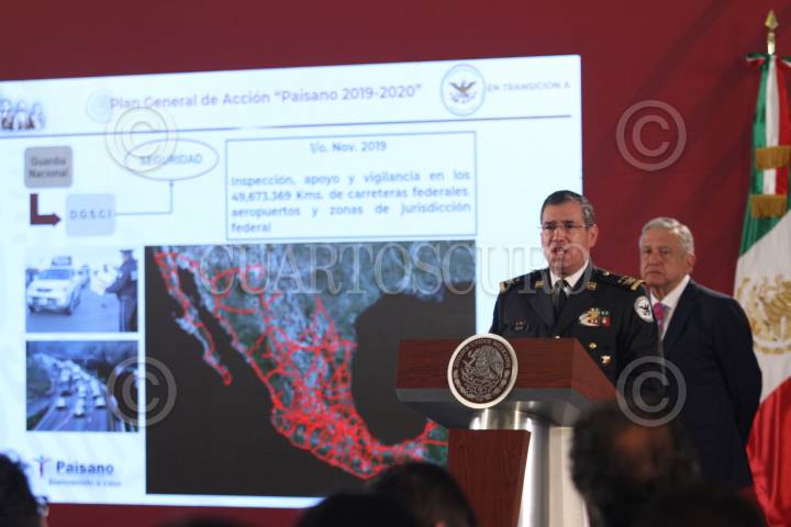 CIUDAD DE MÉXICO, 27NOVIEMBRE2019.- Andrés Manuel López Obrador, presidente de México, acompañado de Luis Rodríguez Bucio, comandante de la Guardia Nacional, durante conferencia diaria en el Palacio Nacional en la que se anunció el programa “Bienvenido Paisano”. También hizo invitación a la celebración por su primer año de gobierno el próximo primero de diciembre en el Zócalo Capitalino. FOTO: ANDREA MURCIA / CUARTOSCURO.COM
