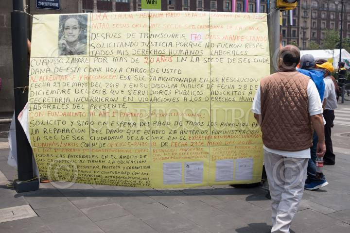 CIUDAD DE MÉXICO, 26JUNIO2019.- Capitalinos colocaron un letrero en forma de protesta en contra de Claudia Sheinbaum, jefa de Gobierno y Jesús Orta Martínez, secretario de Seguridad Ciudadana, para pedir justicia por los derechos laborales de 20 años de un trabajador en la Secretaria de Seguridad Ciudadana y no recibir solución a sus peticiones, esto ocurrió afuera de Palacio de Ayuntamiento. FOTO: GRACIELA LÓPEZ /CUARTOSCURO.COM